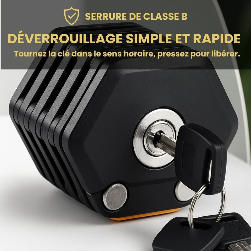 Déverrouillez avec la clé fournie, dépliez l’antivol, entourez le cadre et un point fixe (et si possible une roue), puis enclenchez le cylindre pour verrouiller. Simple et rapide.