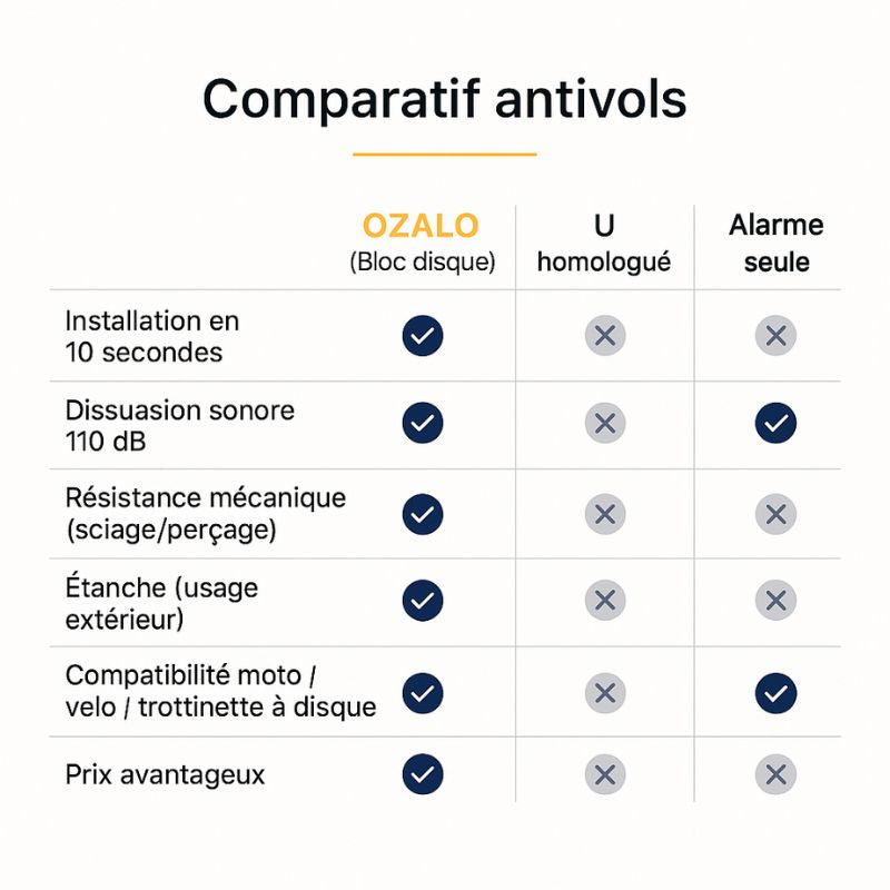 Aucun antivol nâest âinviolableâ. Le bloque-disque + alarme apporte une dissuasion immĂ©diate idĂ©ale pour les arrĂȘts courts (resto, courses).