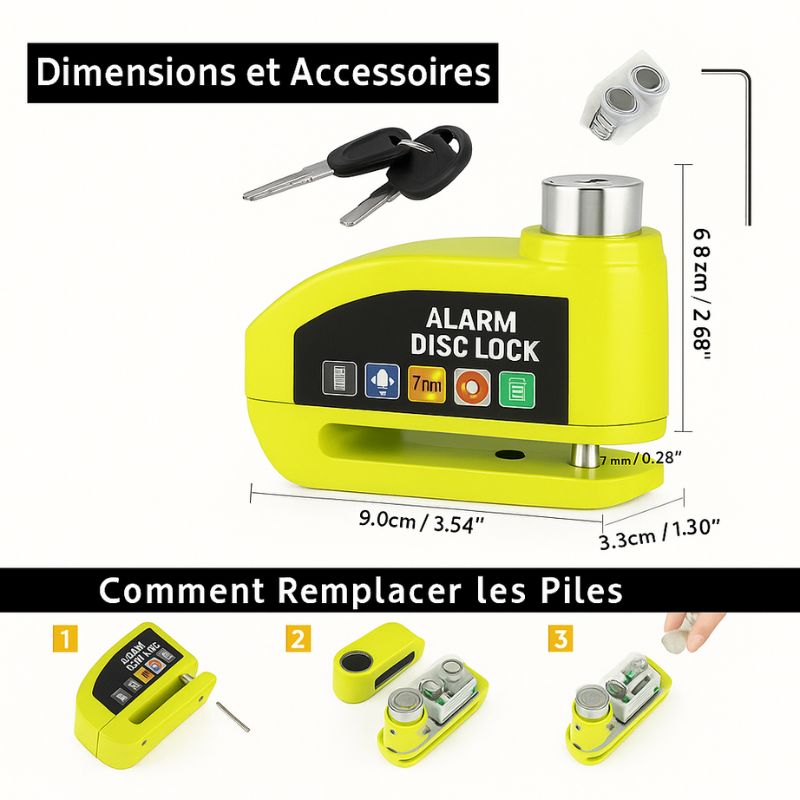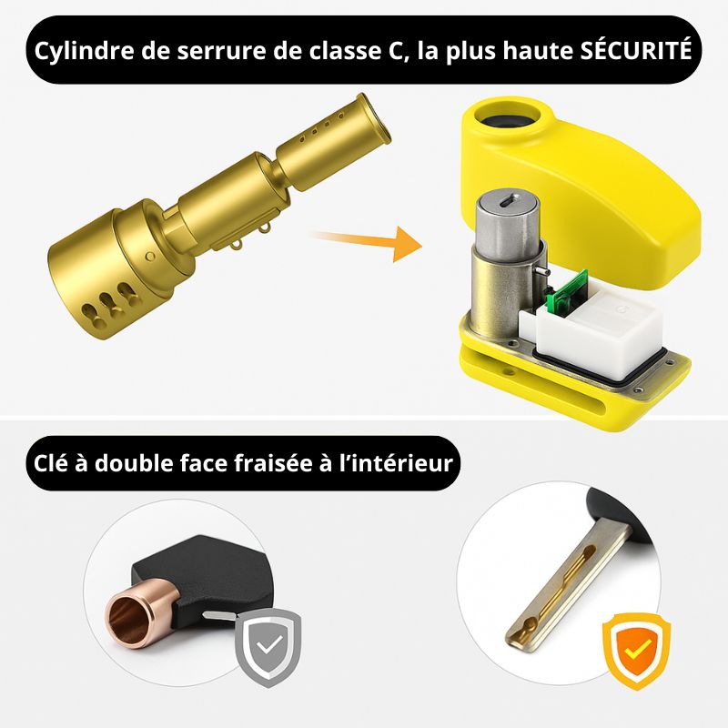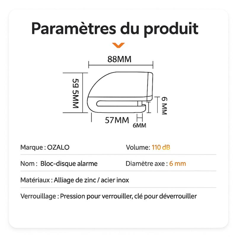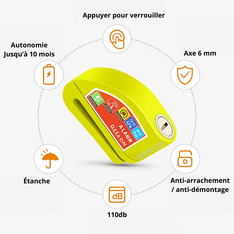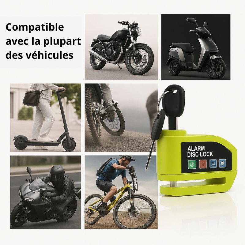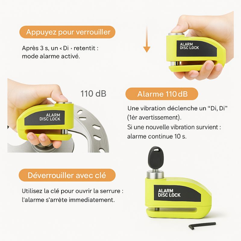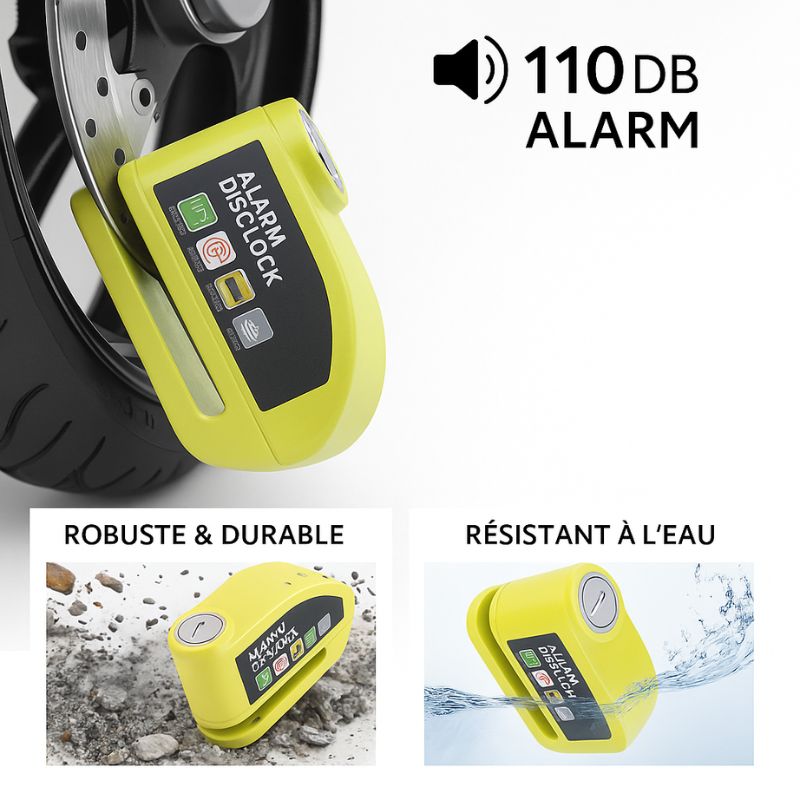 Ce bloque-disque alarme 110 dB est le compagnon idéal pour sécuriser votre vélo, moto ou trottinette.